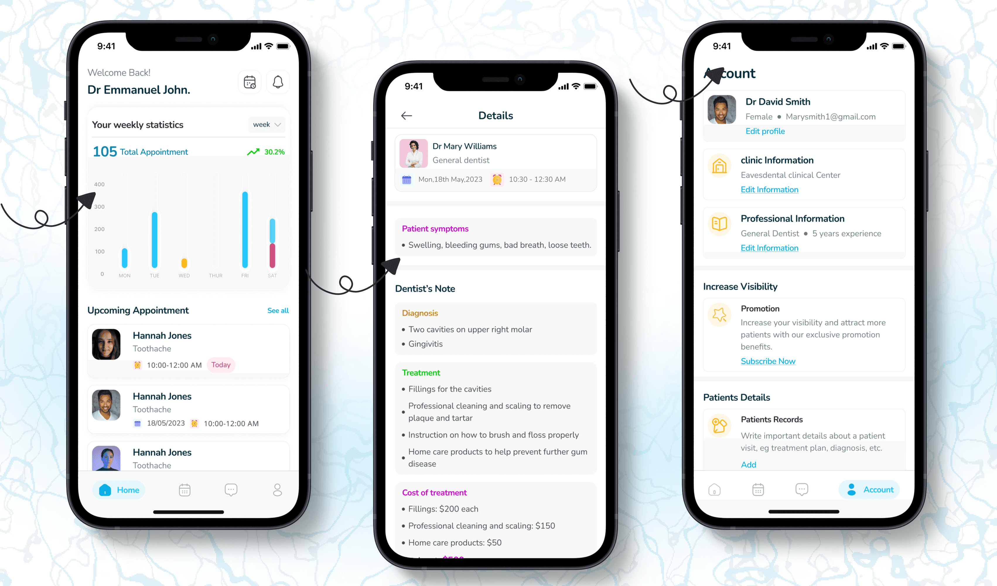 A centralized dashboard for dentists to seamlessly manage schedules, patient details, and communication features.